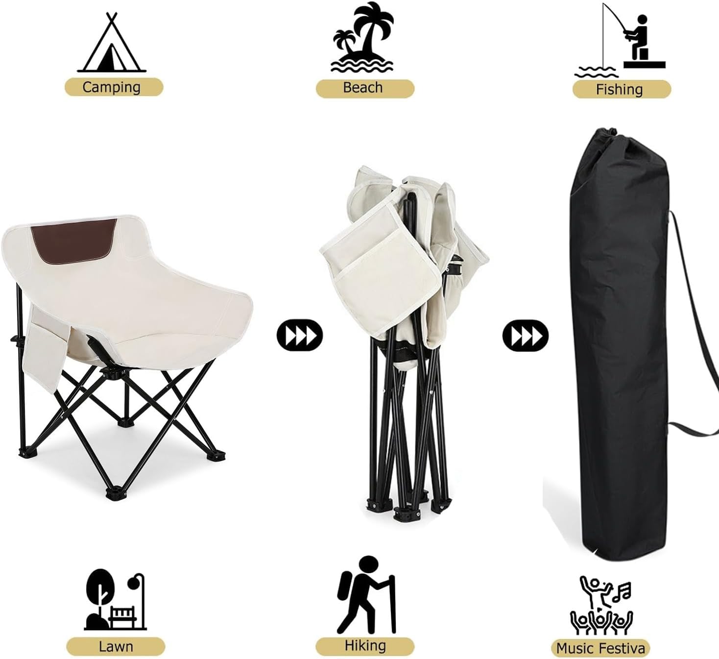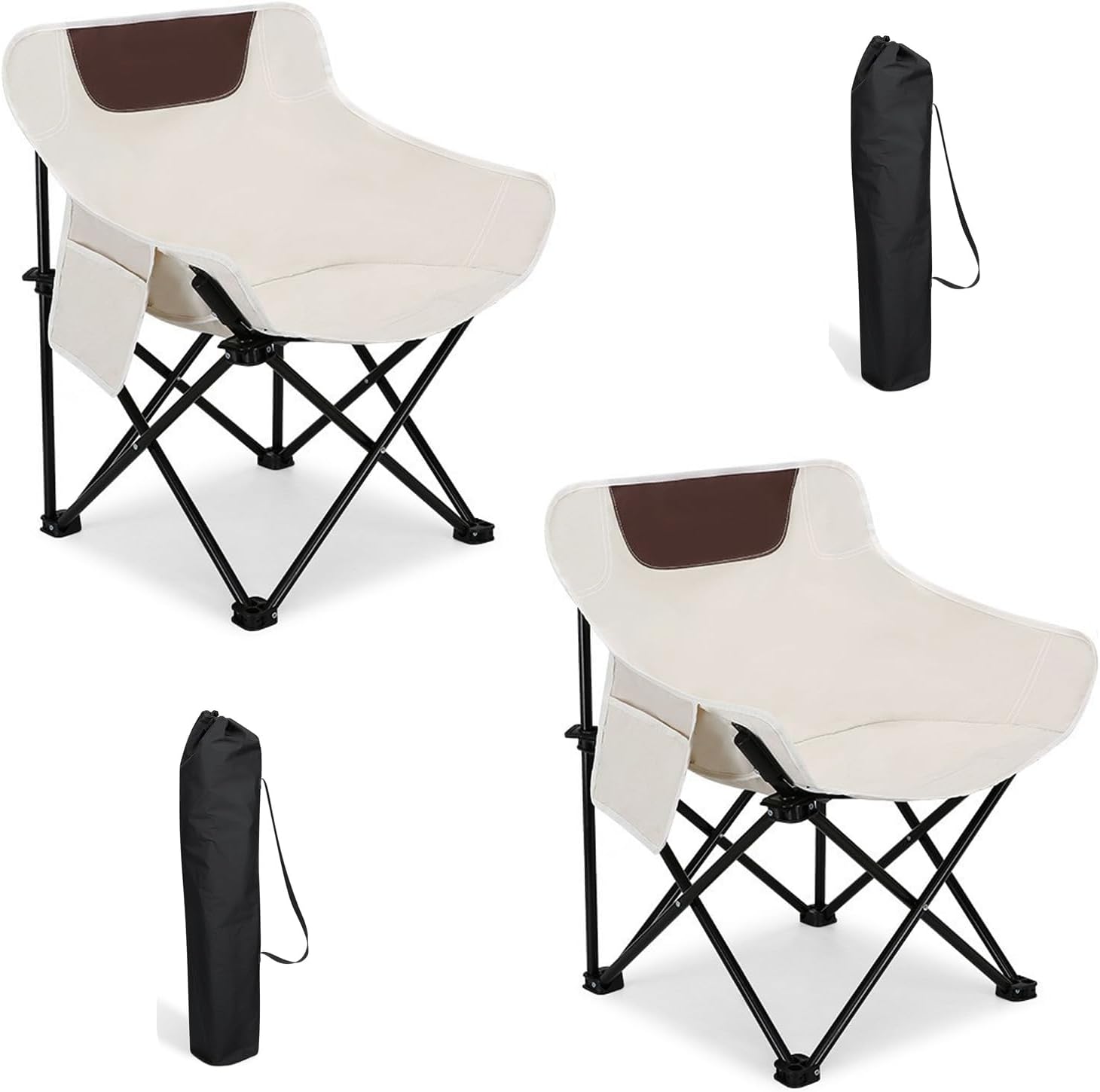 2 PCS Folding Moon Chair - Camping Chair with Side Pocket, Foldable Backpacking Chair Ultra Durable with Camping Light for BBQ, Hiking, Fishing, Picnic (White)